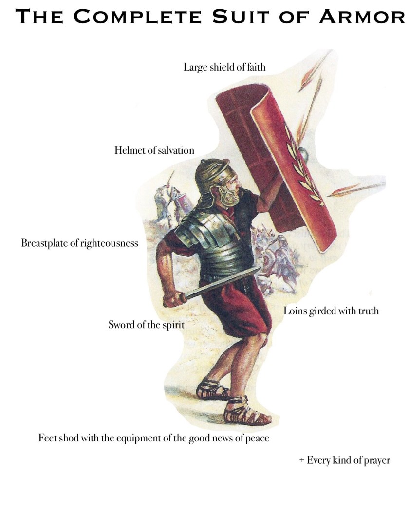 “Finally, be strong in the Lord and in his mighty power. 11 Put on the full armor of God, so that you can take your stand against the devil’s schemes. 12 For our struggle is not against flesh and blood, but against the rulers, against the authorities, against the powers of this dark world and against the spiritual forces of evil in the heavenly realms. 13 Therefore put on the full armor of God, so that when the day of evil comes, you may be able to stand your ground, and after you have done everything, to stand. 14 Stand firm then, with the belt of truth buckled around your waist, with the breastplate of righteousness in place, 15 and with your feet fitted with the readiness that comes from the gospel of peace. 16 In addition to all this, take up the shield of faith, with which you can extinguish all the flaming arrows of the evil one. 17 Take the helmet of salvation and the sword of the Spirit, which is the word of God.